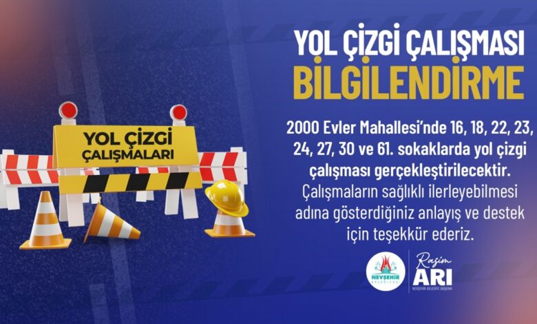 Nevşehir Belediyesi, şehirde trafik güvenliğini artırmak amacıyla asfaltı tamamlanan yolların çizgi çalışmalarına bugün başlıyor. İlk etapta 2000 Evler Mahallesi’ndeki 16, 18, 22, 23, 24, 27, 30 ve 61. sokaklarda uygulanacak çalışmalarla hem araç hem de yaya trafiği daha güvenli hale getirilecek.
