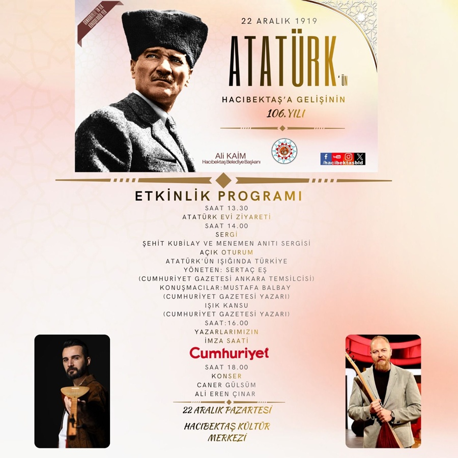 Gazi Mustafa Kemal Atatürk’ün Hacıbektaş’a gelişinin 106. yıl dönümü dolayısıyla 22 Aralık 2025 Pazartesi günü Hacıbektaş’ta bir anma programı gerçekleştirilecek. Etkinlikler, Hacıbektaş Belediyesi tarafından organize edilecek ve gün boyu sürecek.