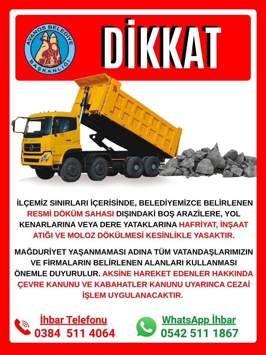 Belediye yetkilileri boş araziler, yol kenarları ve dere yataklarına moloz ve hafriyat dökülmesinin mevzuata aykırı olduğunu belirtti. Vatandaşların ve faaliyet gösteren firmaların, mağduriyet yaşamamaları için yalnızca izinli döküm alanlarını kullanmaları gerektiği ifade edildi.
