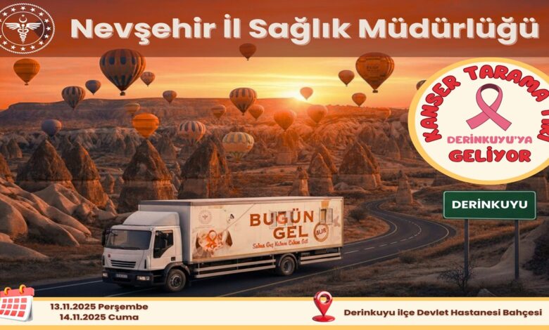 Nevşehir İl Sağlık Müdürlüğü, vatandaşların erken teşhis imkânlarından faydalanabilmesi için kanser tarama tırını Derinkuyu’ya yönlendiriyor. Tır, 13-14 Kasım 2025 tarihlerinde Derinkuyu İlçe Devlet Hastanesi bahçesinde hizmet verecek.