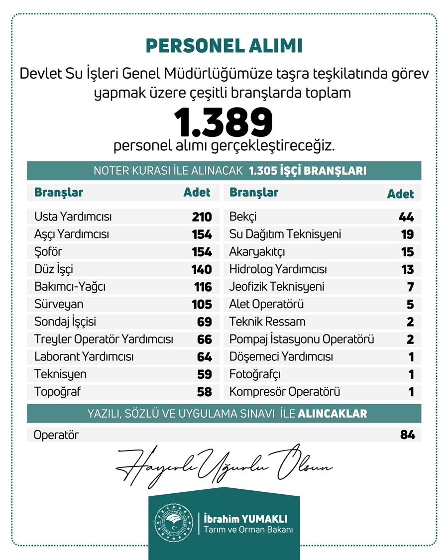 Tarım ve Orman Bakanı İbrahim Yumaklı, Devlet Su İşleri (DSİ) Genel Müdürlüğü taşra teşkilatında görev yapmak üzere toplam 1389 personelin istihdam edileceğini açıkladı. Alımların hem noter kurası hem de sınav yöntemiyle gerçekleştirileceği belirtildi.