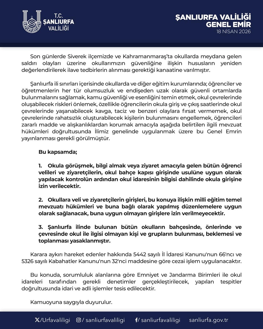 Kahramanmaraş ve Şanlıurfa’da yaşanan okul saldırılarının ardından, eğitim kurumlarında güvenliği artırmaya yönelik yeni uygulamalar yürürlüğe alındı. Şanlıurfa Valiliği tarafından yayımlanan genel emirle birlikte, il genelindeki tüm okullarda kapsamlı tedbirler uygulanmaya başlandı.