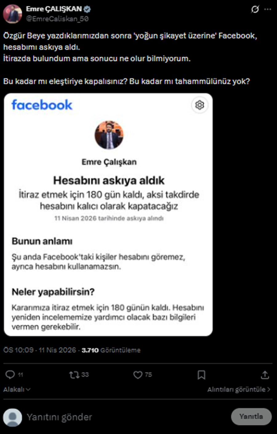 Milletvekili Emre Çalışkan, Facebook tarafından alınan karar sonrası itiraz sürecini başlattığını ve sürecin sonucuna ilişkin kesin bir bilginin bulunmadığını aktardı.