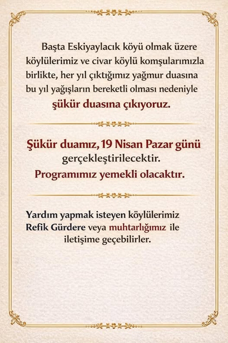 Şükür duasının 19 Nisan 2026 Pazar günü yapılacağı açıklandı. Program kapsamında katılımcılara yemek ikramında bulunulacak.
