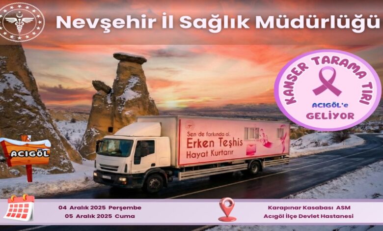 Nevşehir İl Sağlık Müdürlüğü, kanser taramalarına erişimi kolaylaştırmak amacıyla mobil tarama aracıyla ilçeleri ziyaret edecek. Sağlık Bakanlığı tarafından desteklenen kanser tarama tırı, 4 Aralık 2025 Perşembe günü Karapınar Kasabası Aile Sağlığı Merkezinde, 5 Aralık 2025 Cuma günü ise Acıgöl İlçe Devlet Hastanesinde hizmet sunacak.