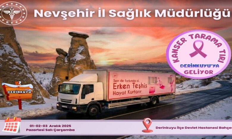 Hazırlanan programa göre kanser tarama tırı, 01–02–03 Aralık 2025 tarihlerinde Derinkuyu İlçe Devlet Hastanesi bahçesinde vatandaşlara ücretsiz hizmet sunacak.