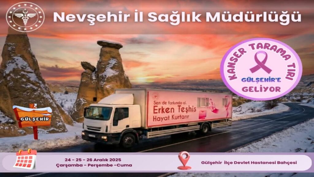 Kanser tarama tırı, 24, 25 ve 26 Aralık 2025 tarihlerinde üç gün boyunca Gülşehir’de hizmet sunacak. Uygulama kapsamında vatandaşlara ücretsiz kanser taramaları yapılacak. Tarama hizmetleriyle, hastalıkların erken dönemde tespit edilmesi ve tedavi sürecine zamanında başlanması hedefleniyor.