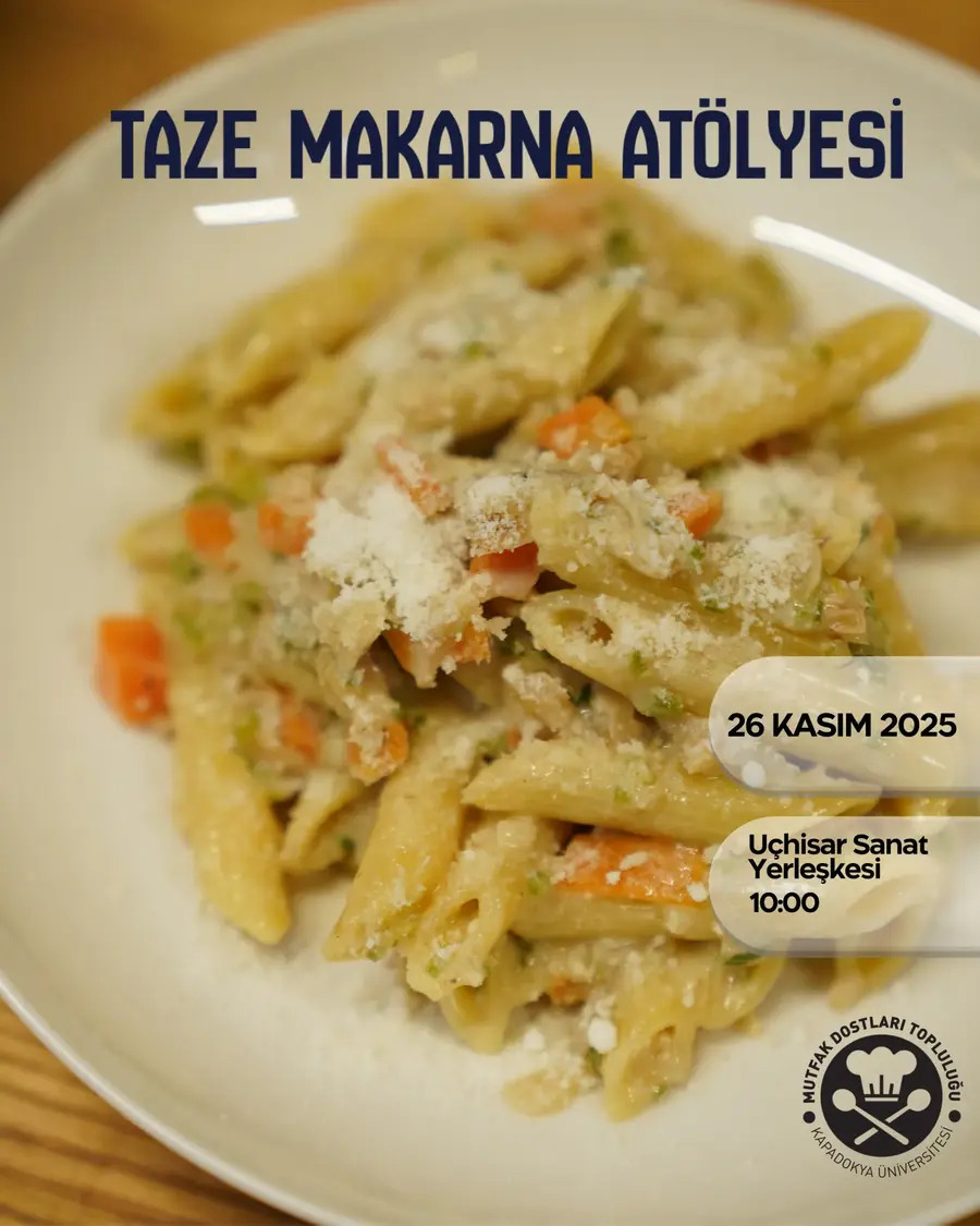 Kapadokya Üniversitesi, gastronomi meraklılarını Uçhisar Sanat Yerleşkesi’nde düzenlenecek Taze Makarna Atölyesi’nde bir araya getiriyor. Etkinlik 26 Kasım’da saat 10.00’da başlayacak.