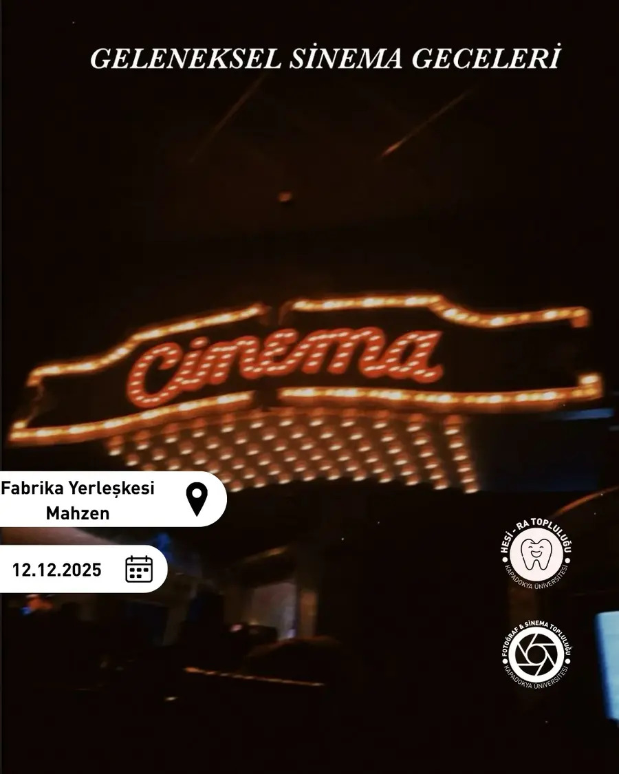 Kapadokya Üniversitesi, Geleneksel Sinema Geceleri kapsamında 12 Aralık 2025’te Fabrika Yerleşkesi Mahzen Salonu’nda yeni bir etkinlik düzenliyor. Sinemaya ilgi duyan katılımcılar, seçilmiş film gösterimlerinin yer alacağı buluşmada bir araya gelecek.