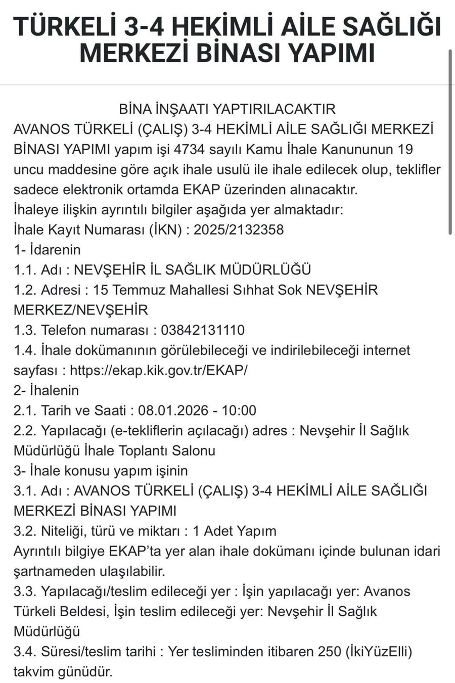 Milletvekili Çalışkan’ın verdiği bilgiye göre 3–4 hekim kapasiteli Aile Sağlığı Merkezi binasının ihalesi 8 Ocak 2026 Perşembe günü saat 10.00’da gerçekleştirilecek. İhale sürecinin tamamlanmasının ardından merkezin yaklaşık 250 gün içinde tamamlanarak hizmete açılması planlanıyor.