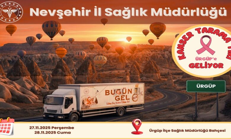 Kanser tarama tırı, 27 ve 28 Kasım 2025 tarihlerinde Ürgüp İlçe Sağlık Müdürlüğü bahçesinde hazır bulunacak. Vatandaşlar, ücretsiz olarak sunulacak taramalardan yararlanarak sağlık kontrollerini yaptırabilecek.