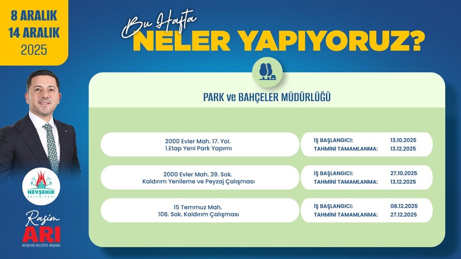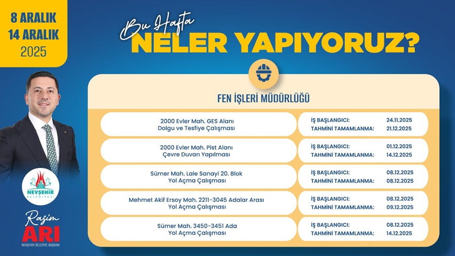 Nevşehir Belediyesi, 8–14 Aralık 2025 döneminde kent genelinde yürütülen altyapı ve üstyapı faaliyetlerine ilişkin haftalık çalışma planını paylaştı. Fen İşleri, Su ve Kanalizasyon ile Park ve Bahçeler müdürlüklerine bağlı ekipler, farklı mahallelerde planlanan projeleri takvim doğrultusunda sürdürecek.