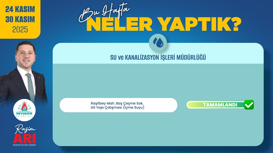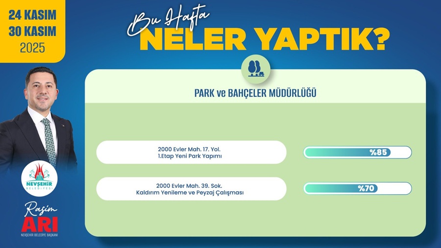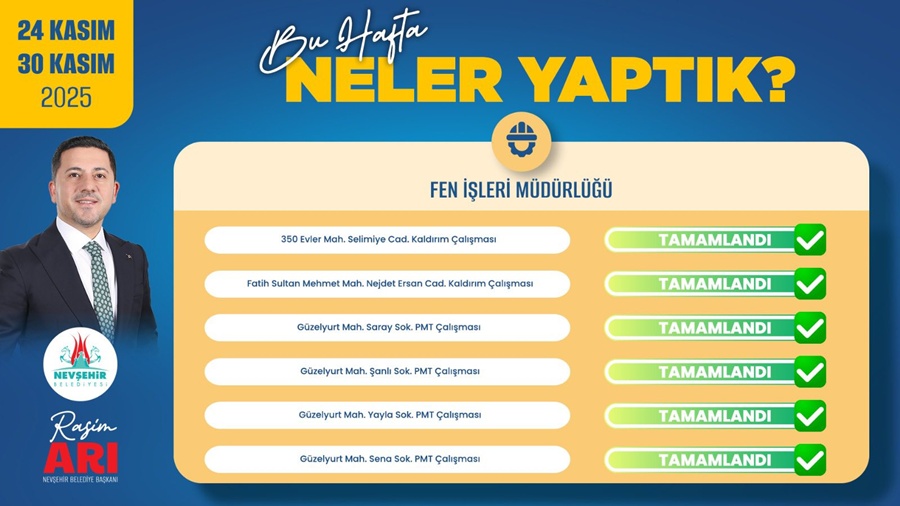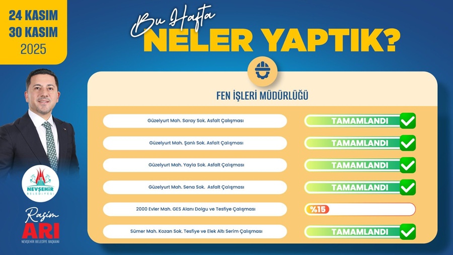 Nevşehir Belediyesi, kent genelinde yürüttüğü haftalık saha çalışmalarının son durumunu paylaştı. Fen İşleri, Su ve Kanalizasyon ile Park ve Bahçeler müdürlüklerinin farklı mahallelerde eş zamanlı olarak sürdürdüğü faaliyetlerde, birçok noktanın tamamlandığı, bazı projelerde ise çalışmaların belirli oranlarda ilerlediği bildirildi.