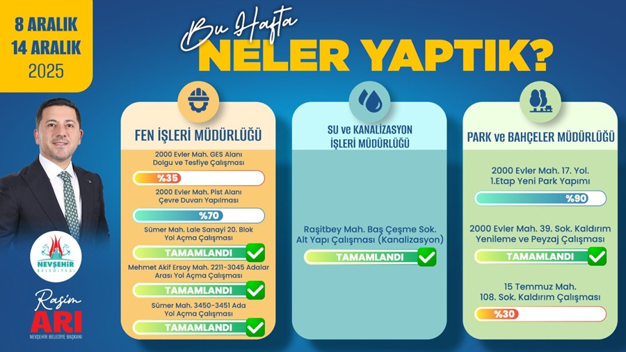 Nevşehir Belediyesi, 8–14 Aralık 2025 tarihlerini kapsayan haftada kent genelinde altyapı, üstyapı ve çevre düzenlemelerine yönelik çalışmalarını sürdürdü. Fen İşleri, Su ve Kanalizasyon ile Park ve Bahçeler müdürlükleri tarafından yürütülen faaliyetlerde birçok noktada önemli ilerlemeler kaydedildi.