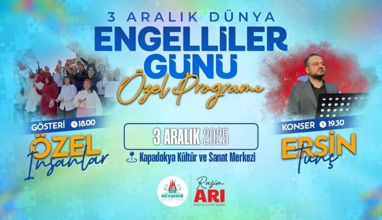 Nevşehir Belediyesi, 3 Aralık Dünya Engelliler Günü kapsamında Kapadokya Kültür ve Sanat Merkezi’nde geniş katılımlı bir etkinlik programı hazırladı. Nevşehir Belediyesi Kültür, Sanat ve Sosyal İşler Müdürlüğü tarafından organize edilen program, çeşitli gösteriler ve konserlerle gerçekleştirilecek.