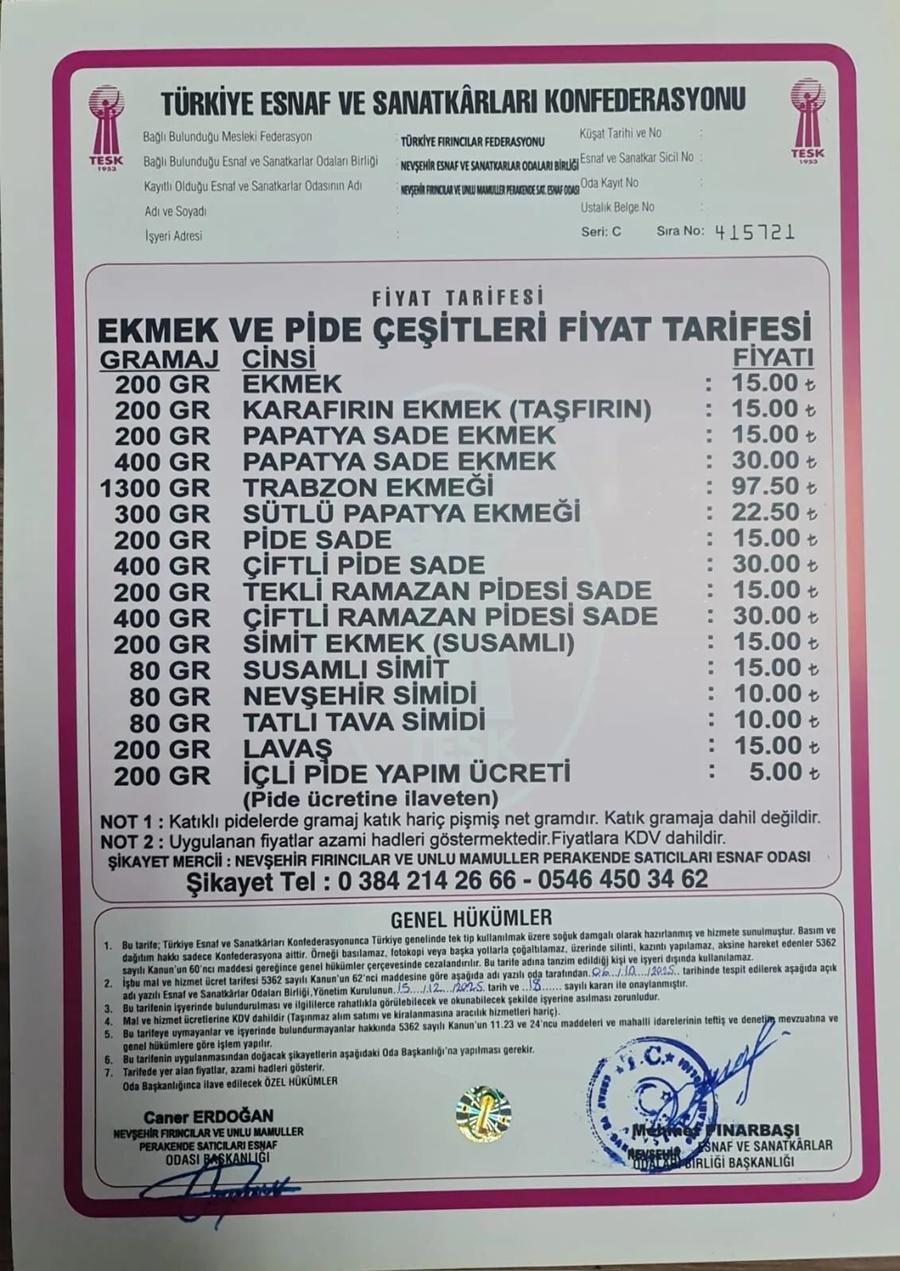 Nevşehir’de ekmek ve unlu mamullerin satış fiyatları güncellendi. Nevşehir Fırıncılar ve Unlu Mamuller Perakende Satıcıları Esnaf Odası tarafından hazırlanan yeni tarife, 16 Aralık 2025 Salı günü itibarıyla uygulanmaya başlanacak.