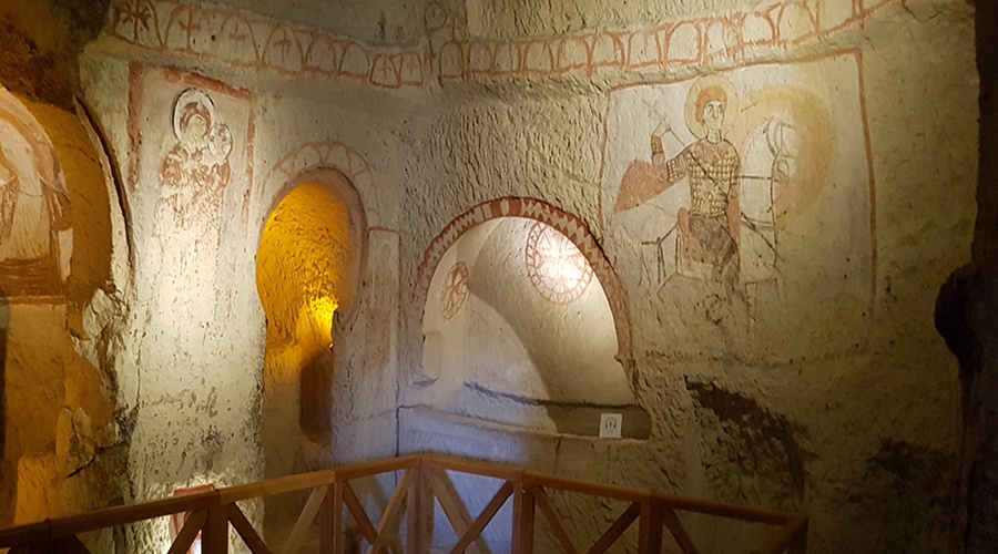 Yılanlı Kilise, adını fresklerdeki yılan ya da ejderhaya benzer figürlerden alır; bu, St. George’un ejderhayı yenmesini betimleyen sahneden kaynaklanır. Ayrıca burada St. Theodore ve diğer azizlerin betimlendiği sahneler de bulunur. Kilise, barrel tonozlu bir tavan yapısına sahiptir ve erken dönem Hristiyan ikonografisinin bölgesel yorumlarını içerir. Bu freskler, sadece dini temaları değil; aynı zamanda dönemin yerel inanç dünyasını da yansıtır.