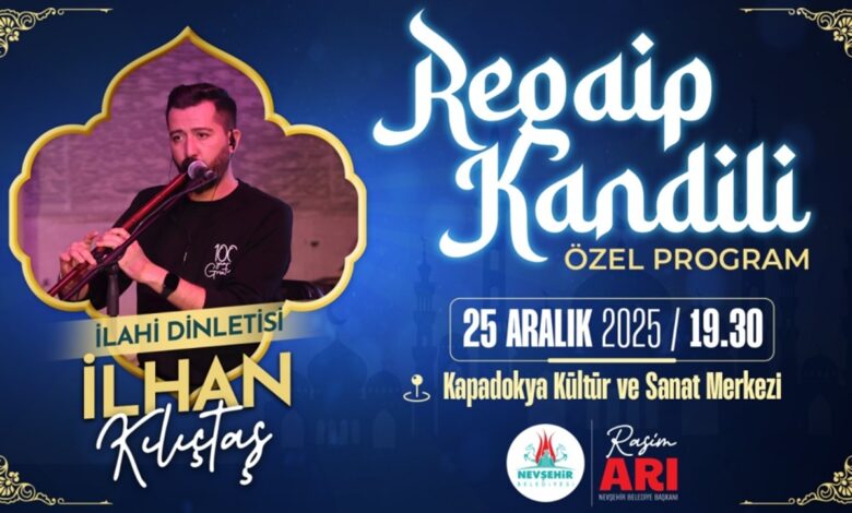 Nevşehir Belediyesi, Regaip Kandili dolayısıyla vatandaşlara yönelik özel bir ilahi programı düzenleyecek. Üç ayların başlangıcını simgeleyen Regaip Kandili kapsamında gerçekleştirilecek etkinlik, 25 Aralık 2025 Perşembe günü Kapadokya Kültür ve Sanat Merkezi’nde yapılacak.