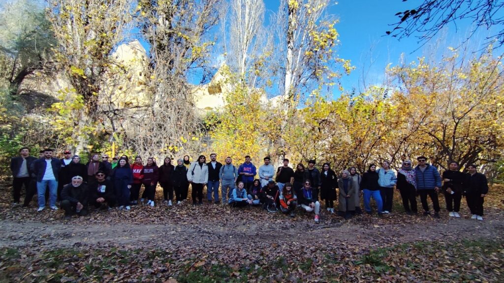 Kapadokya’nın öne çıkan doğal alanlarından biri olan Güvercinlik Vadisi’nde düzenlenen yürüyüşte öğrenciler, sonbaharın karakteristik renk geçişleriyle bütünleşmiş vadide bir rota tamamladı.
