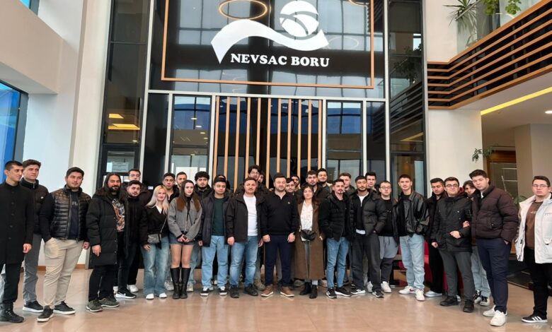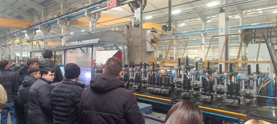 Teknik gezi kapsamında ilk olarak NEVSAC Boru tesislerine gidildi. Öğrenciler, çelik sacın hammadde olarak tesise girişinden nihai ürün hâline gelene kadar geçen üretim aşamalarını detaylı şekilde inceleme imkânı buldu. Kesim, şekillendirme, kaynak, ölçülendirme ve kalite kontrol süreçleri hakkında teknik bilgiler paylaşıldı.