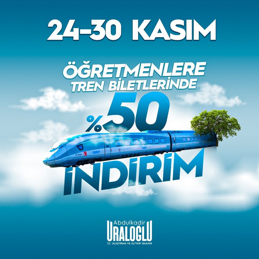 Ulaştırma ve Altyapı Bakanlığı, öğretmenlere yönelik özel bir indirim kampanyası başlattı. 24–30 Kasım 2025 tarihleri arasında geçerli olacak kampanya kapsamında, tüm öğretmenler yüksek hızlı tren (YHT) ve anahat tren biletlerinde yüzde 50 indirimden faydalanabilecek.