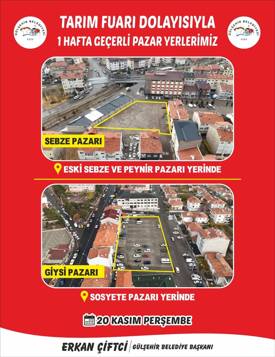 Gülşehir Belediyesi, fuar süreciyle bağlantılı olarak ilçe pazar yerlerinde de geçici bir düzenlemeye gitti. Buna göre fuar nedeniyle bir hafta süreyle geçerli olmak üzere pazar yerlerinin kullanım planı yeniden düzenlendi. Açıklamaya göre: