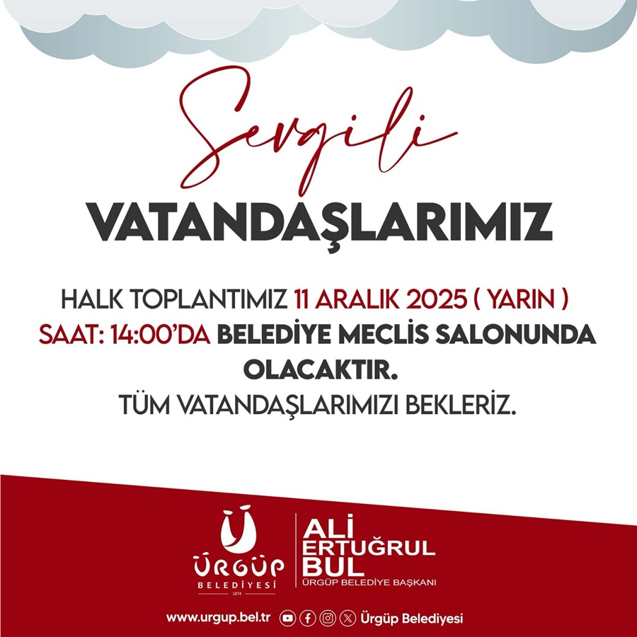 Ürgüp Belediyesi, kent genelindeki vatandaşların talep ve görüşlerini doğrudan iletebilmesi amacıyla düzenlenen halk toplantısının bugün yapılacağını duyurdu. Belediye tarafından verilen bilgiye göre buluşma, 11 Aralık 2025 Perşembe günü saat 14.00’te Belediye Meclis Salonu’nda gerçekleştirilecek.