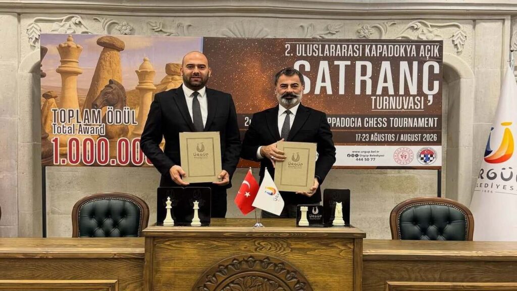 Ürgüp Belediyesi, 2026 yılının Ağustos ayında düzenlenecek satranç turnuvası için önemli bir adım attı. Ürgüp Belediye Başkanı Ali Ertuğrul Bul ile Türkiye Satranç Federasyonu Başkanı Fethi Apaydın arasında organizasyon protokolü imzalandı.