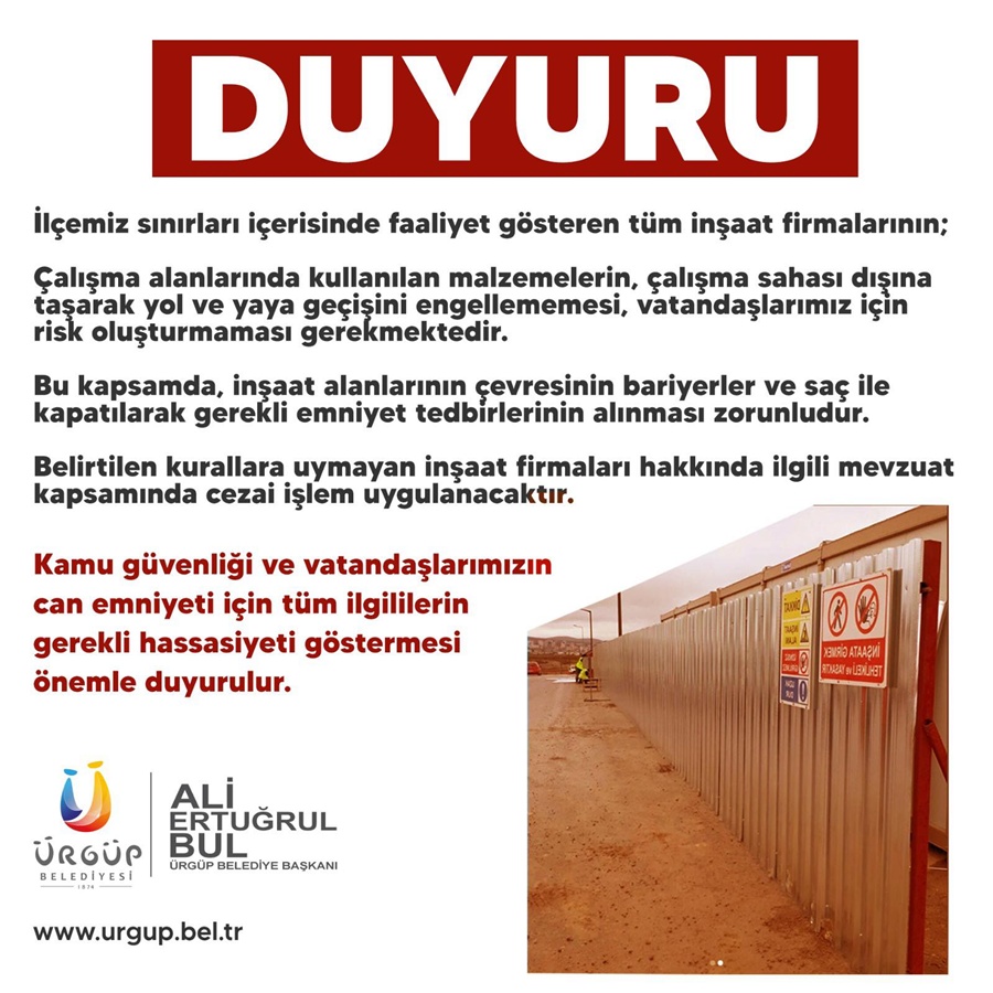 Ürgüp Belediyesi, inşaat faaliyetleri yürüten tüm kişi ve kuruluşlardan gerekli hassasiyeti göstermelerini talep ederek, ilçe genelinde güvenli ve düzenli bir çalışma ortamının sağlanmasının önemine işaret etti.