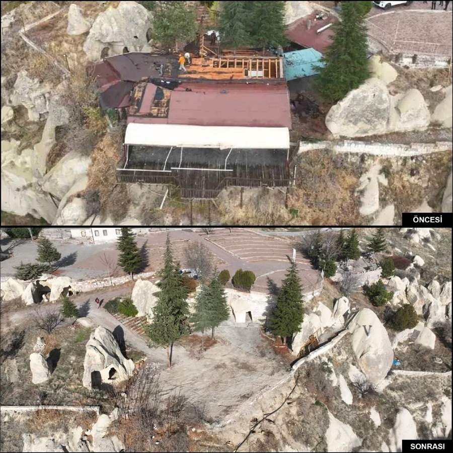 Kapadokya’da 3. Derece Arkeolojik Sit Alanı üzerinde izinsiz işletilen kafe yıkıldı; bölge, doğal ve tarihi dokusuna uygun şekilde yeniden düzenlendi.