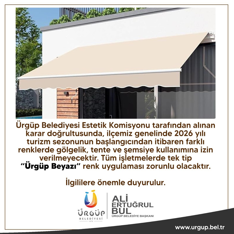 Ürgüp Belediyesi, kent görünümünde birlik sağlamak amacıyla aldığı yeni kararı kamuoyuyla paylaştı. Belediye bünyesindeki Estetik Komisyonu tarafından yapılan değerlendirme sonucunda, 2026 turizm sezonundan itibaren işletmelerde farklı renklerde tente, gölgelik ve şemsiye kullanımı kaldırıldı.