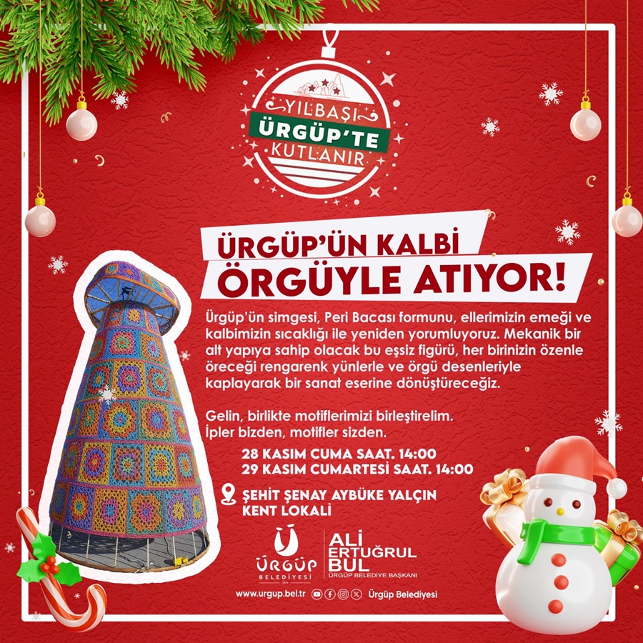 Ürgüp ilçesinde, yerel halk yeni yıl hazırlıklarını el emeğiyle birleştirecek özel bir etkinlikte buluşuyor. Ürgüp Belediyesi tarafından düzenlenen etkinlikte, ilçenin simgesi olan Peribacaları, katılımcıların hazırlayacağı renkli örgülerle süslenecek.