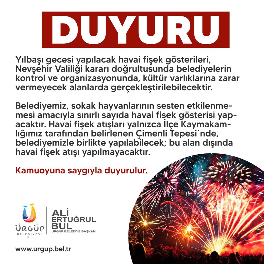 Ürgüp’te yılbaşı gecesi gerçekleştirilecek havai fişek gösterilerine ilişkin uygulama esasları netleşti. Nevşehir Valiliği tarafından alınan karar doğrultusunda, havai fişek etkinlikleri belediyelerin denetimi ve organizasyonu kapsamında yapılacak.