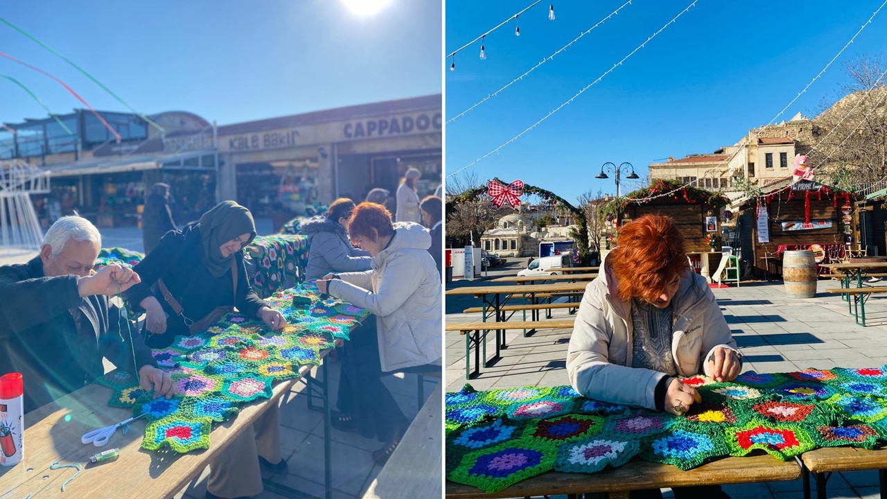 Ürgüp’te yılbaşı hazırlıkları kapsamında dikkat çeken bir çalışma hayata geçirildi. İlçe merkezinde yer alan ve demir iskeleyle desteklenen 5,5 metre yüksekliğindeki bir peribacası, kadın dayanışmasıyla hazırlanan örgü motiflerle kaplanmaya başlandı.